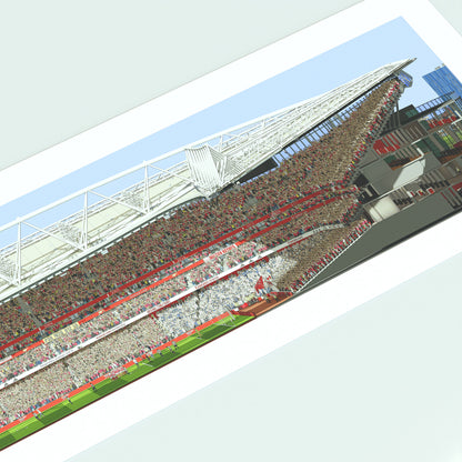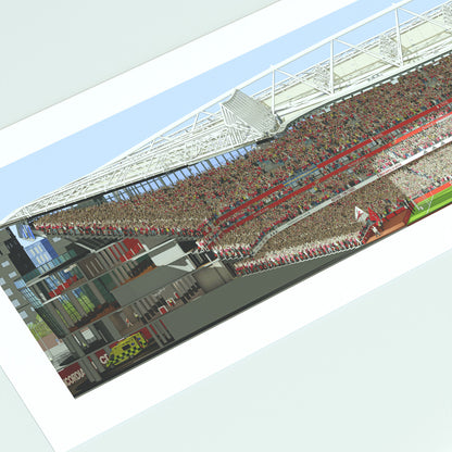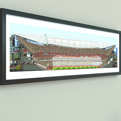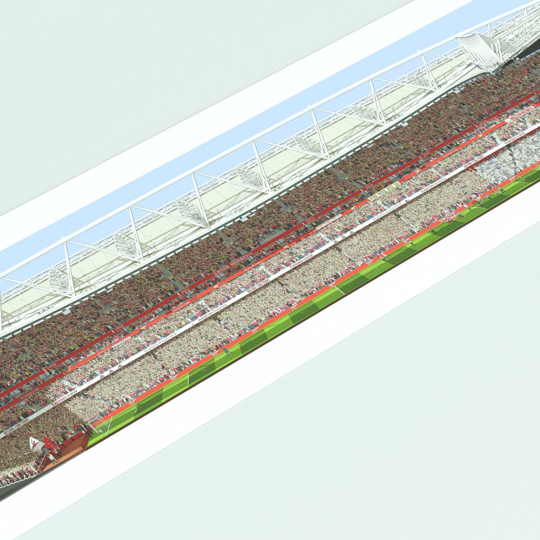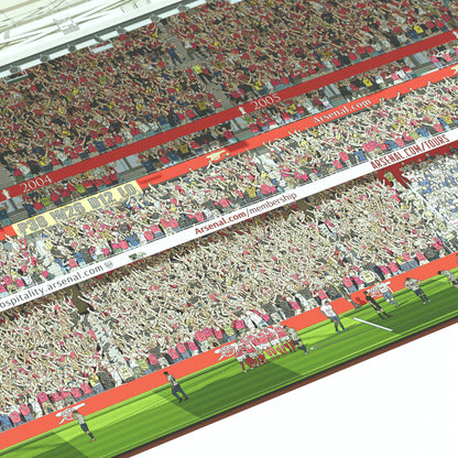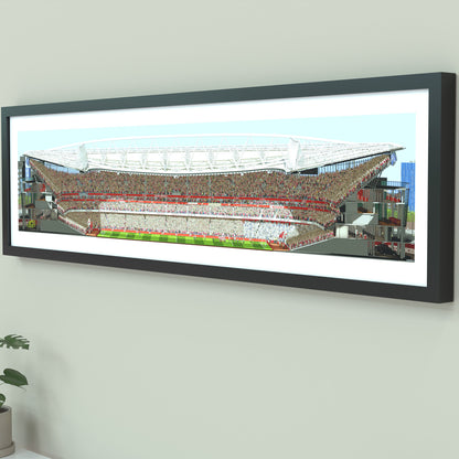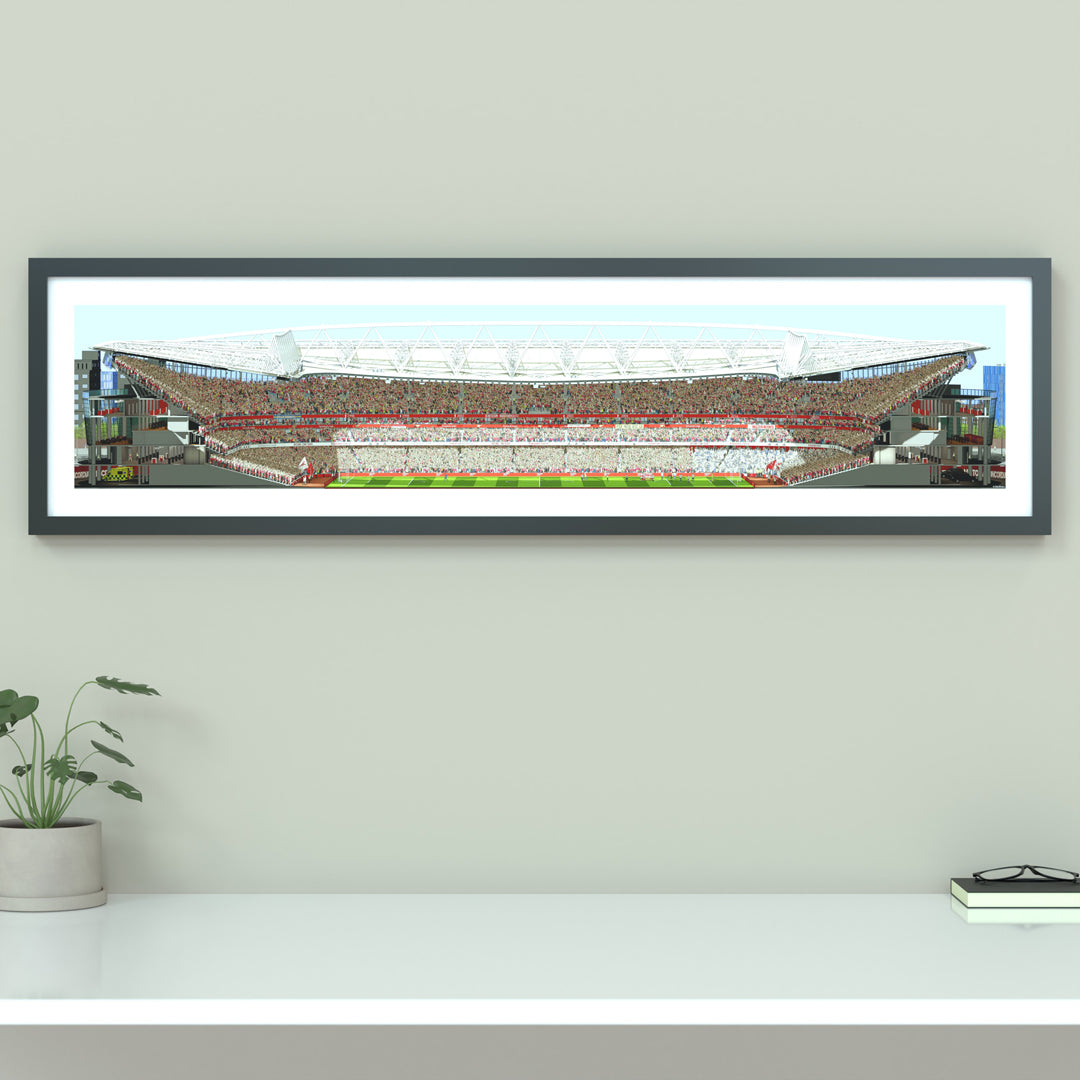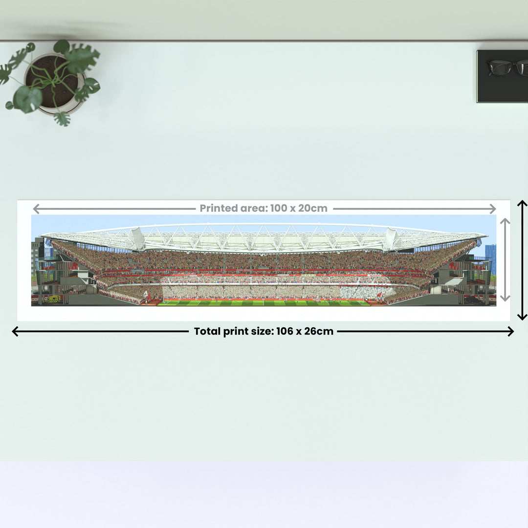 Transform your home or workspace with the thrill of match day using this beautifully crafted panoramic print of Arsenal's Emirates Stadium. Featuring a detailed illustration from the West Stand, this artwork offers a captivating perspective that brings the essence of being at the game to life.