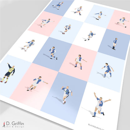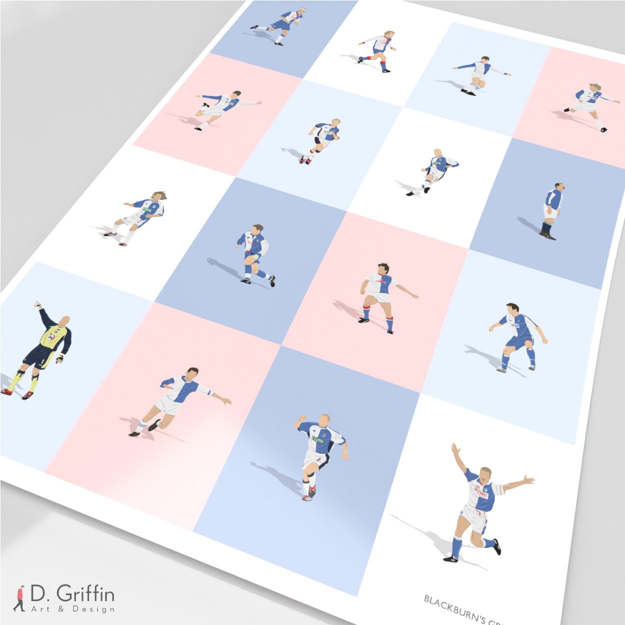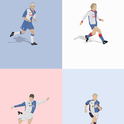 Featured players include (from top to bottom, left to right): Colin Hendry, Derek Fazackerley, Bryan Douglas, Tim Sherwood, Chris Sutton, Damien Duff, Henning Berg, Bob Crompton, Tugay Kerimoglu, Graeme Le Saux, Simon Garner, Ryan Nelsen, Brad Friedel, Ronnie Clayton, David Dunn, Alan Shearer.
