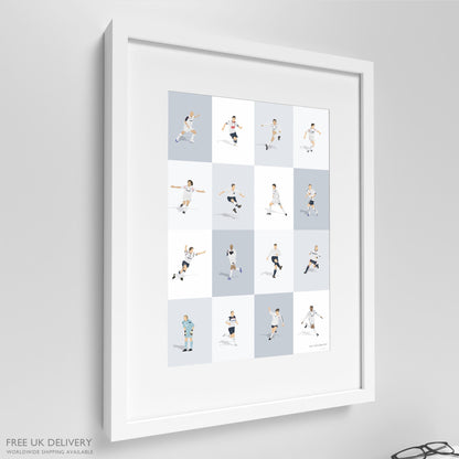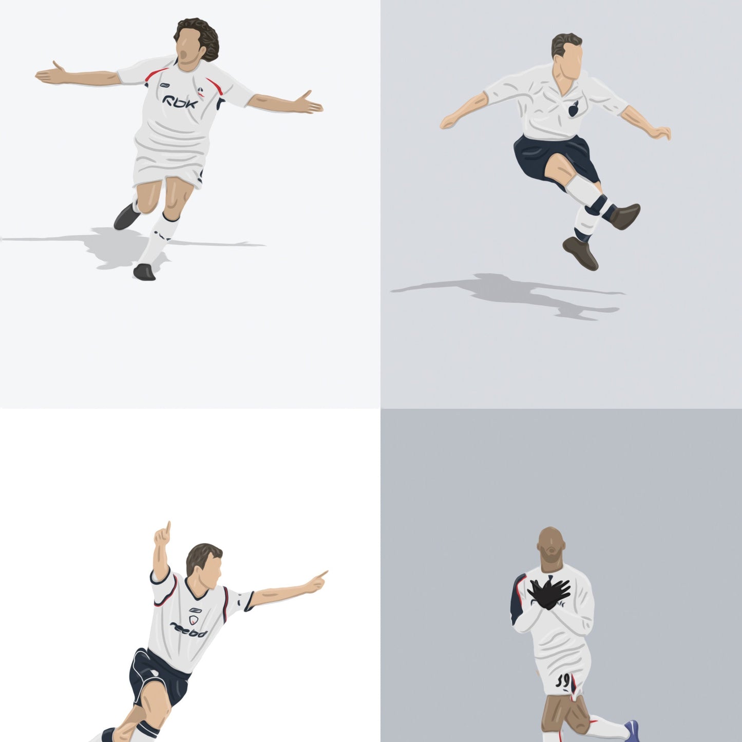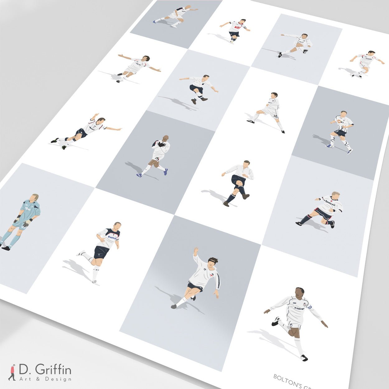 Featured players include (from top to bottom, left to right): Stelios Giannakopoulos, Mark Davies, Youri Djorkaeff, Gary Speed, Ivan Campo, Nat Lofthouse OBE, Fernando Hierro, Gary Cahill, Gudni Bergsson, Nicolas Anelka, David Jack, John McGinlay, Jussi Jaaskelainen, Kevin Nolan, Frank Worthington, Jay-Jay Okocha.
