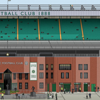 The image provides an unusual view of Celtic park and offers a glimpse inside the stadium which can not be seen from Celtic way. Dozens of photographs of Celtic park were used in the making of the image in order to capture the typical pre-match experience outside the stadium.