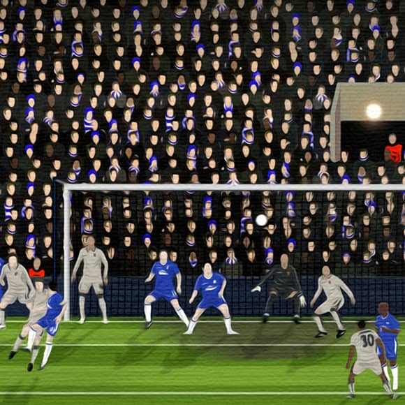 A Champions League classic at Stamford Bridge: This print depicts the John Terry header that sealed a 4-2 victory for Chelsea over Barcelona in the 2004/05 Champions league knockout stages.