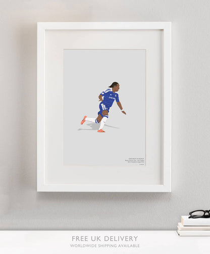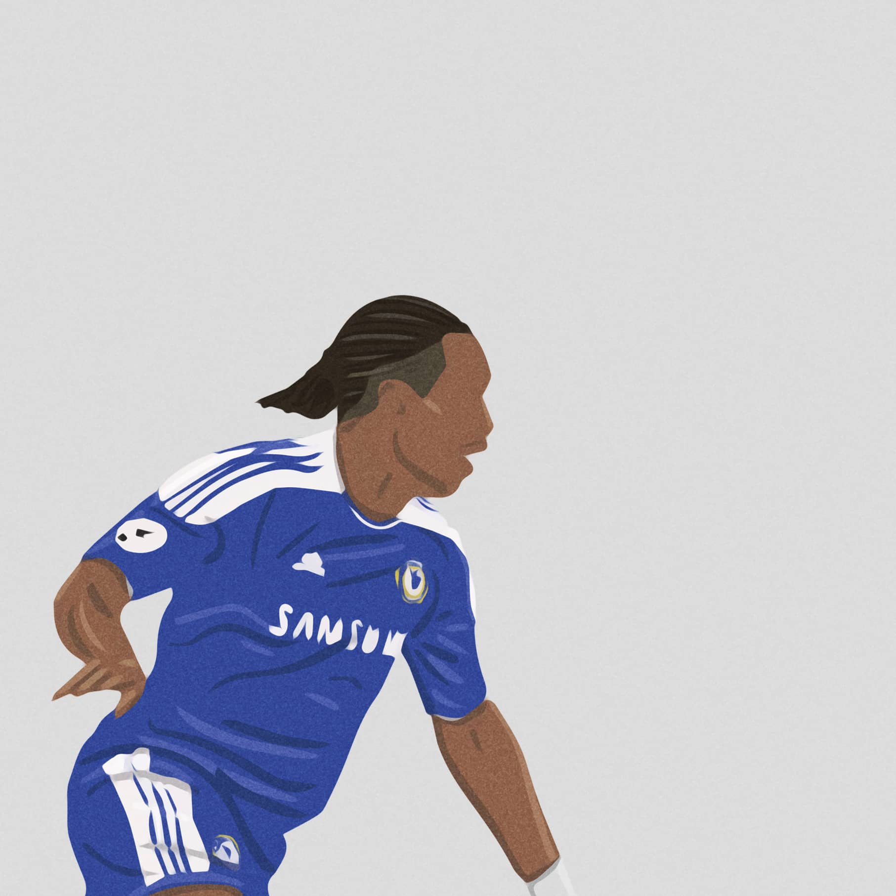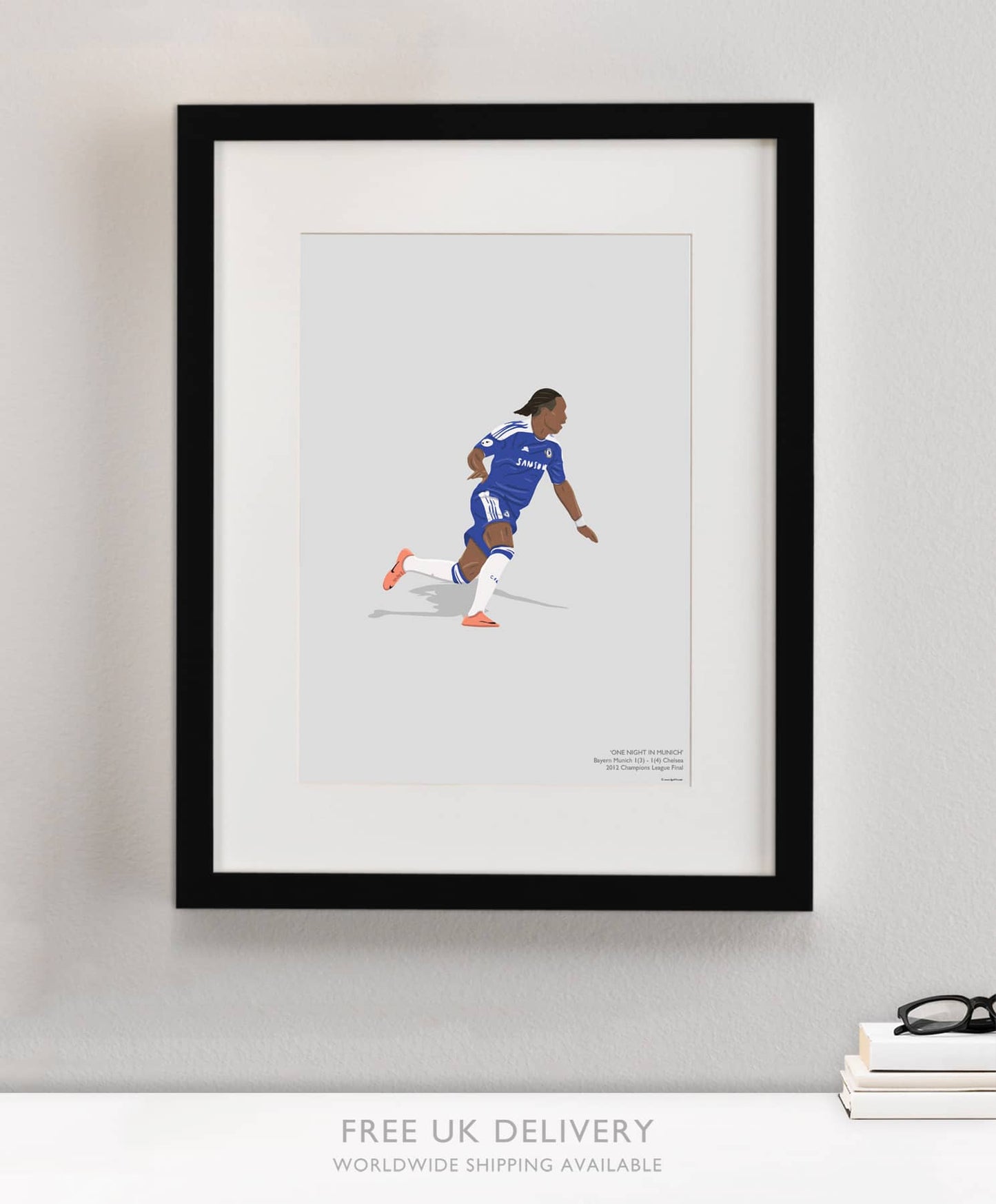 Depicting Didier Drogba celebrating his winning penalty for Chelsea in the 2012 Champions League Final against Bayern Munich.