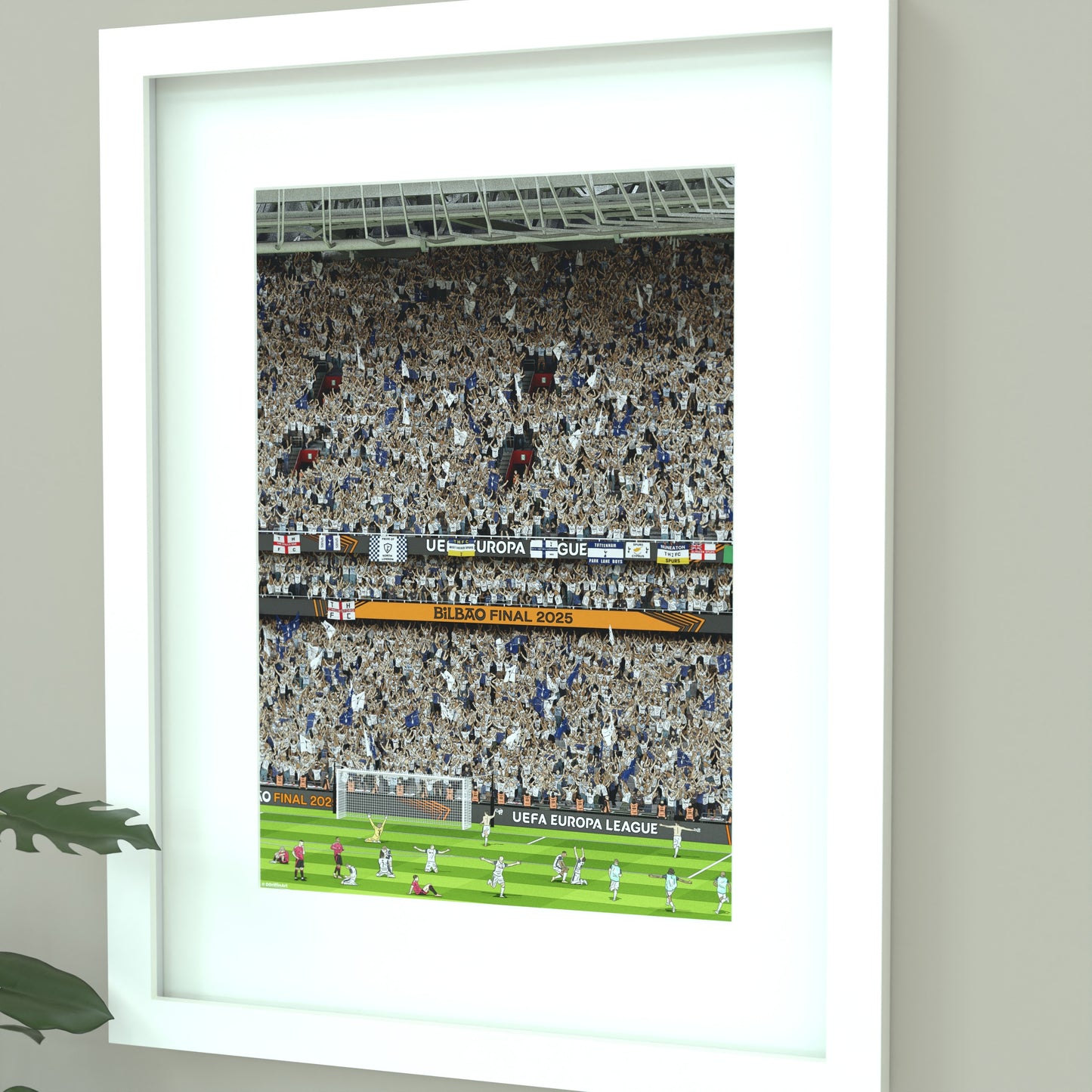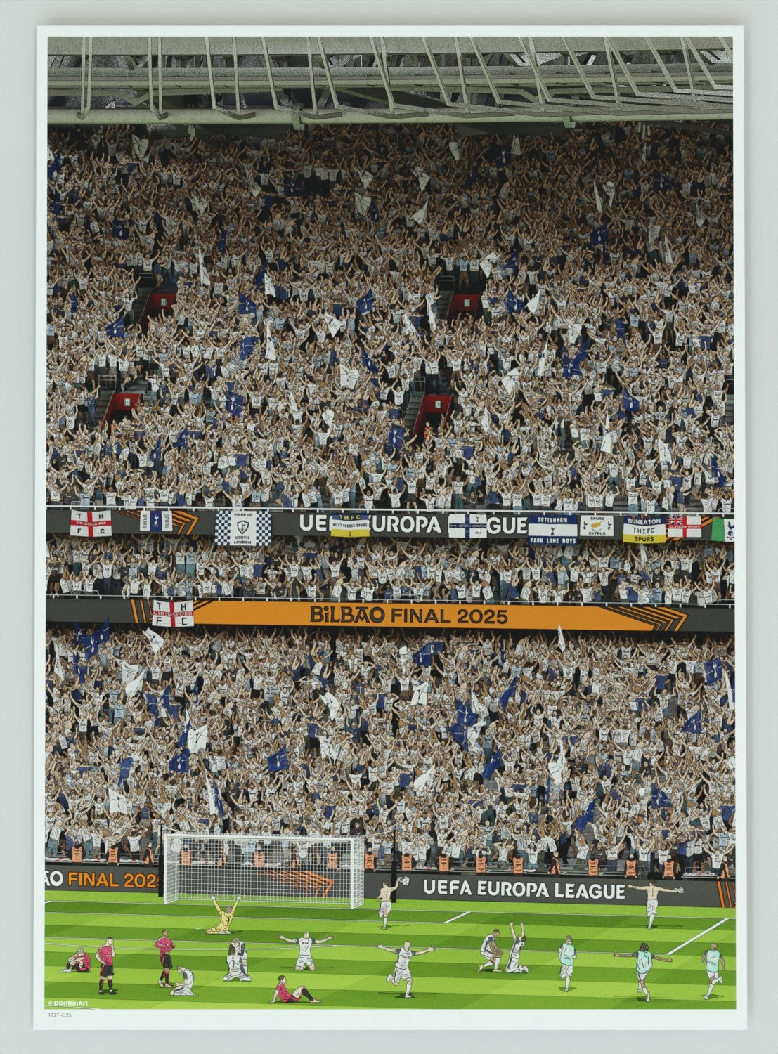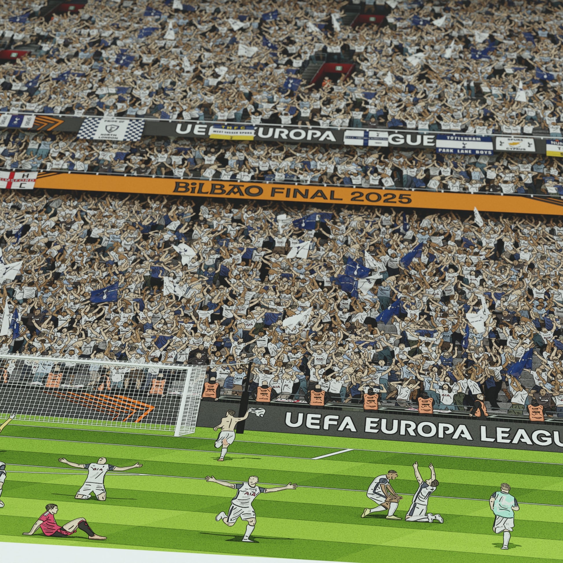 An illustration capturing the unforgettable celebrations at the final whistle of the 2025 Europa League Final between Tottenham and Manchester United on May 21st, 2025. A must-have piece for any Spurs fan reliving this historic moment.