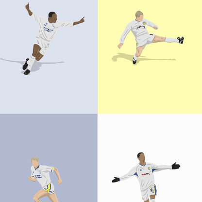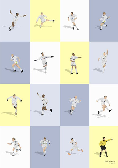Featured players include (from top to bottom, left to right): Yeboah, Batty, Dorigo, Strachan, Chapman, Beckford, Radebe, Smith, Bowyer, Hasselbaink, Sharpe, Viduka, Becchio, Mccalister, Snodgrass, Martyn.