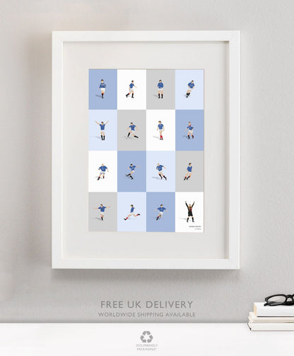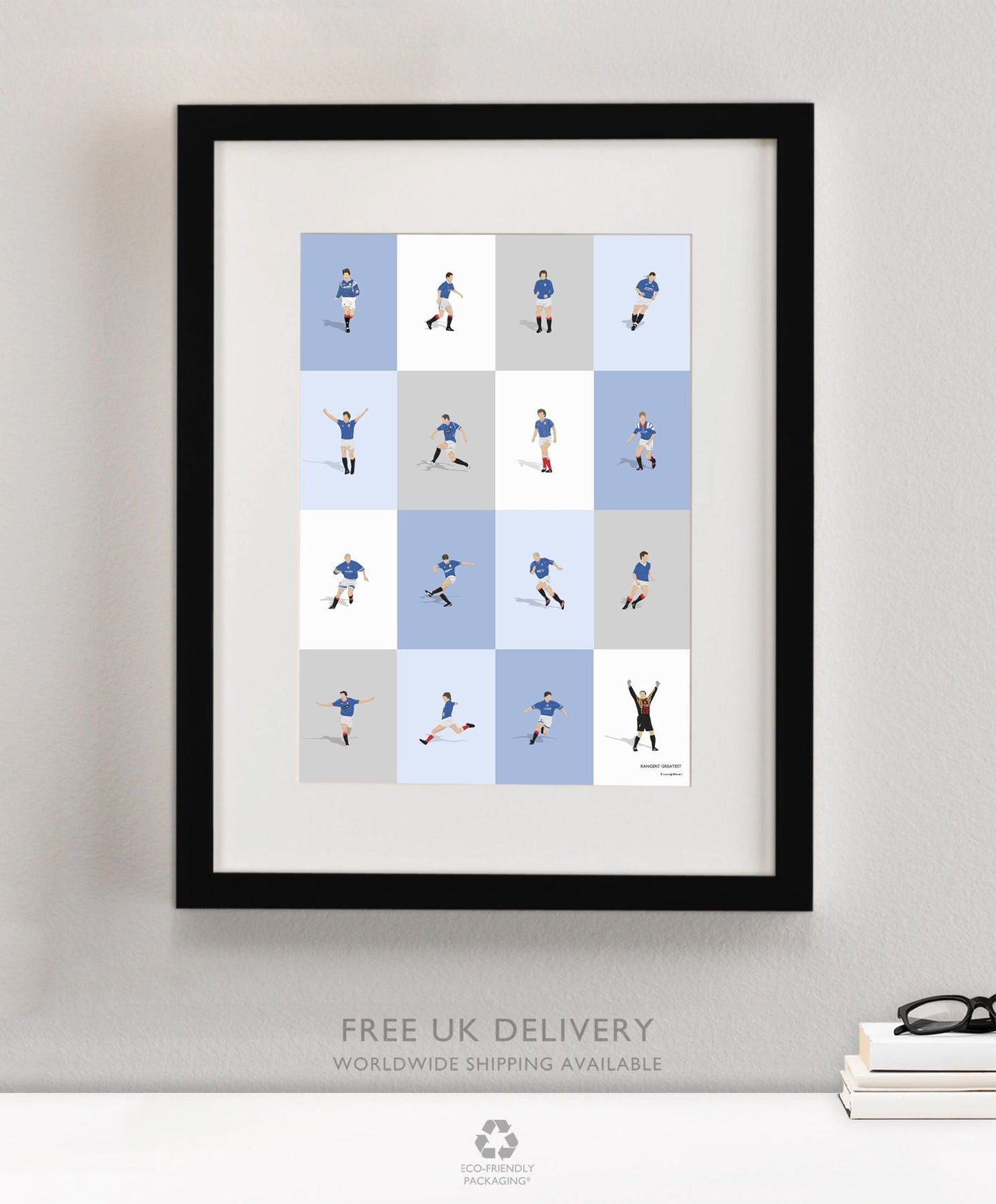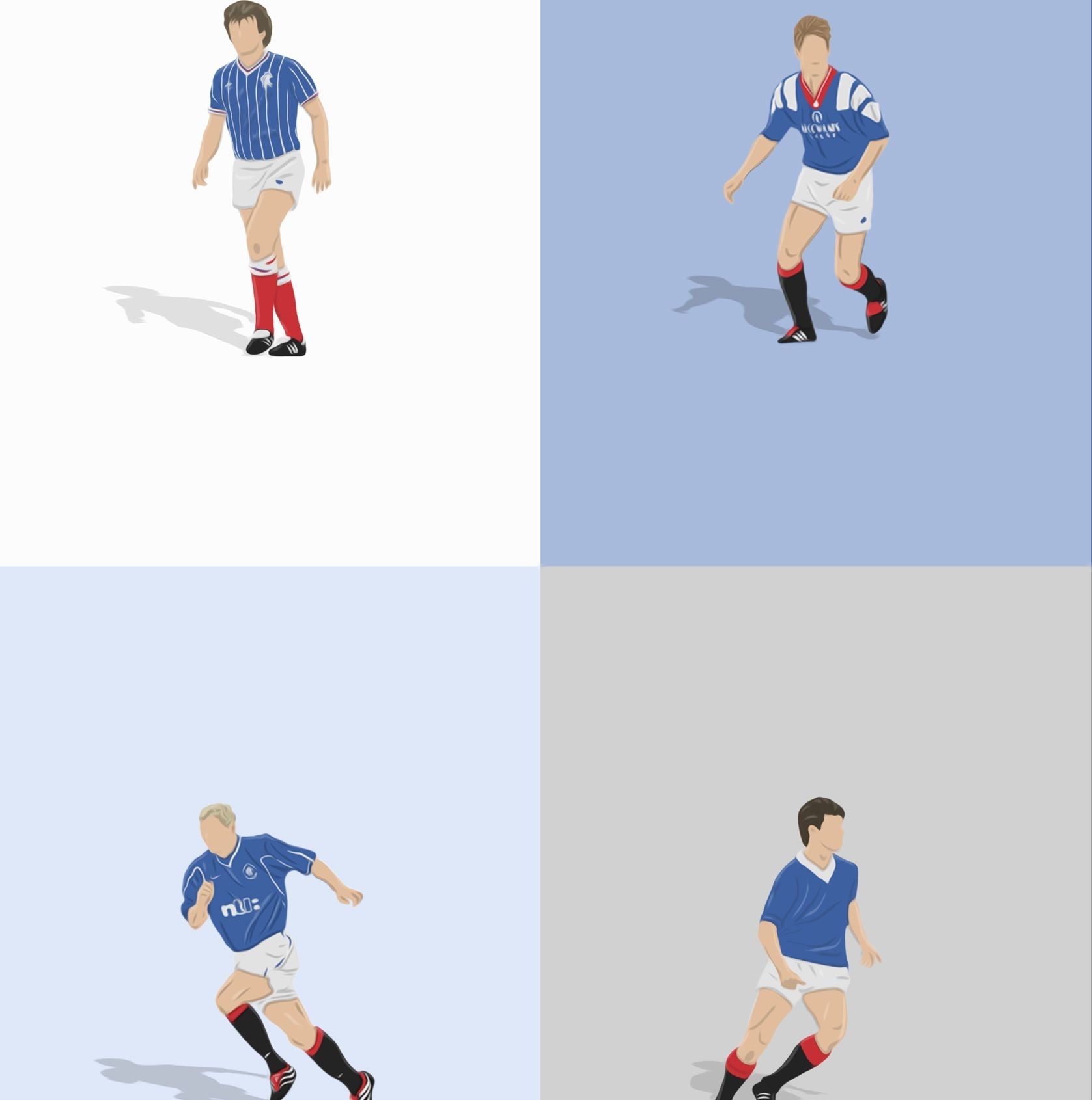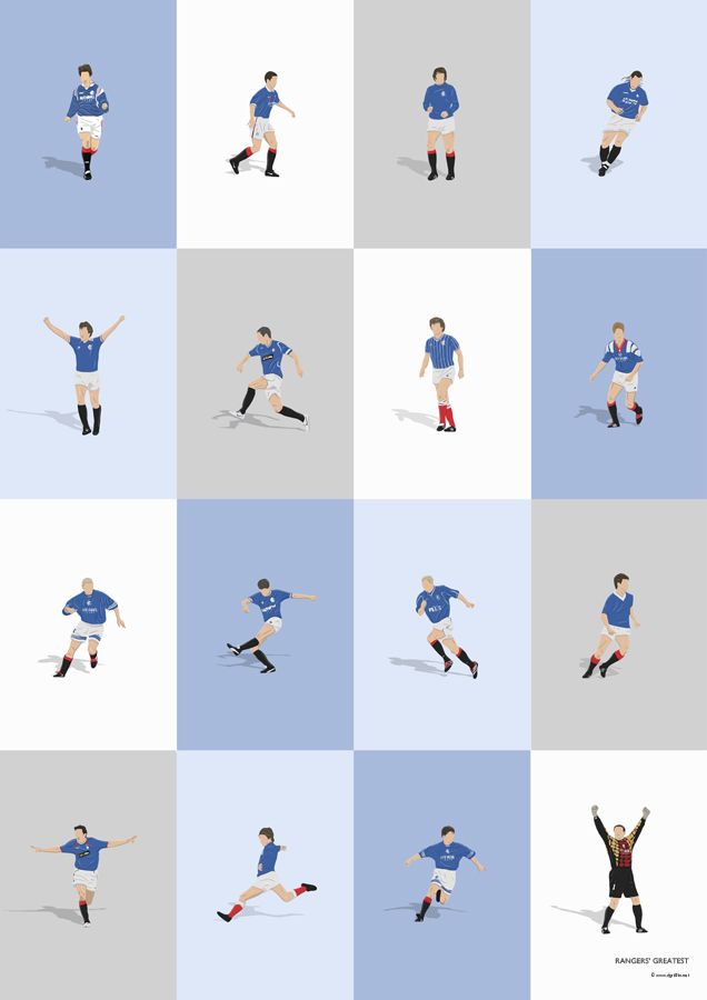 Featured players include (from top to bottom, left to right): Brian Laudrup, Barry Ferguson, John Greig, Lorenzo Amoruso, Sandie Jardine, David Weir, Davie Cooper, Richard Gough, Paul Gascoigne, Ian Durrant, Jörg Albertz, Jim Baxter, Nacho Novo, Willie Johnson, Ally McCoist, Andy Goram.