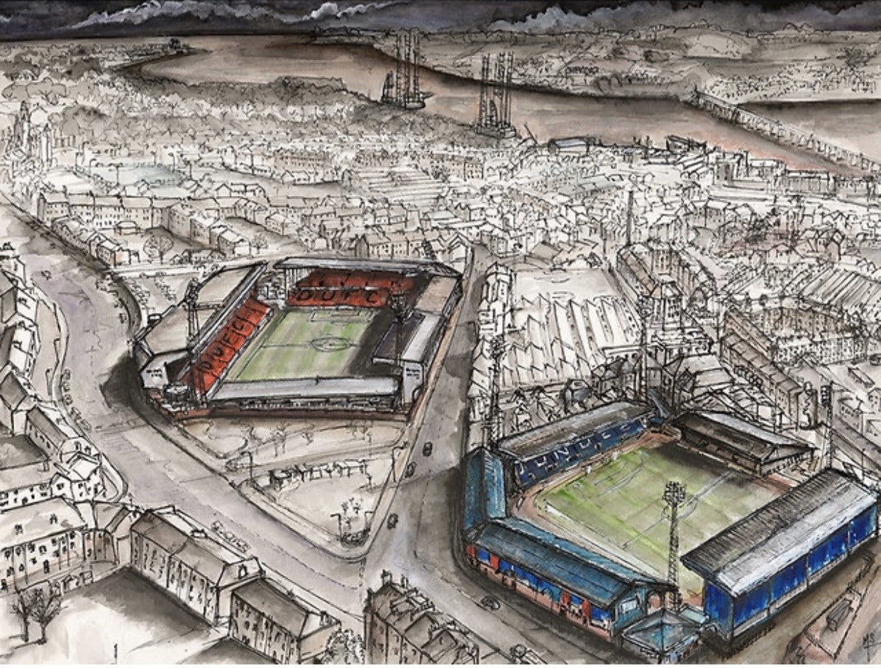 Introducing a masterpiece that captures the essence of Dundee's football heritage like never before. This stunning painting brings to life the iconic Dens Park and Tannadice Park, situated a mere 352 yards apart, making them the closest pair of professional football grounds in the entire United Kingdom.