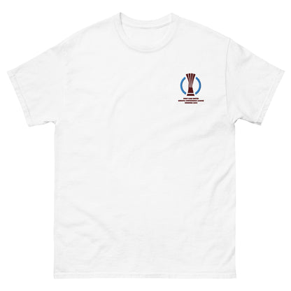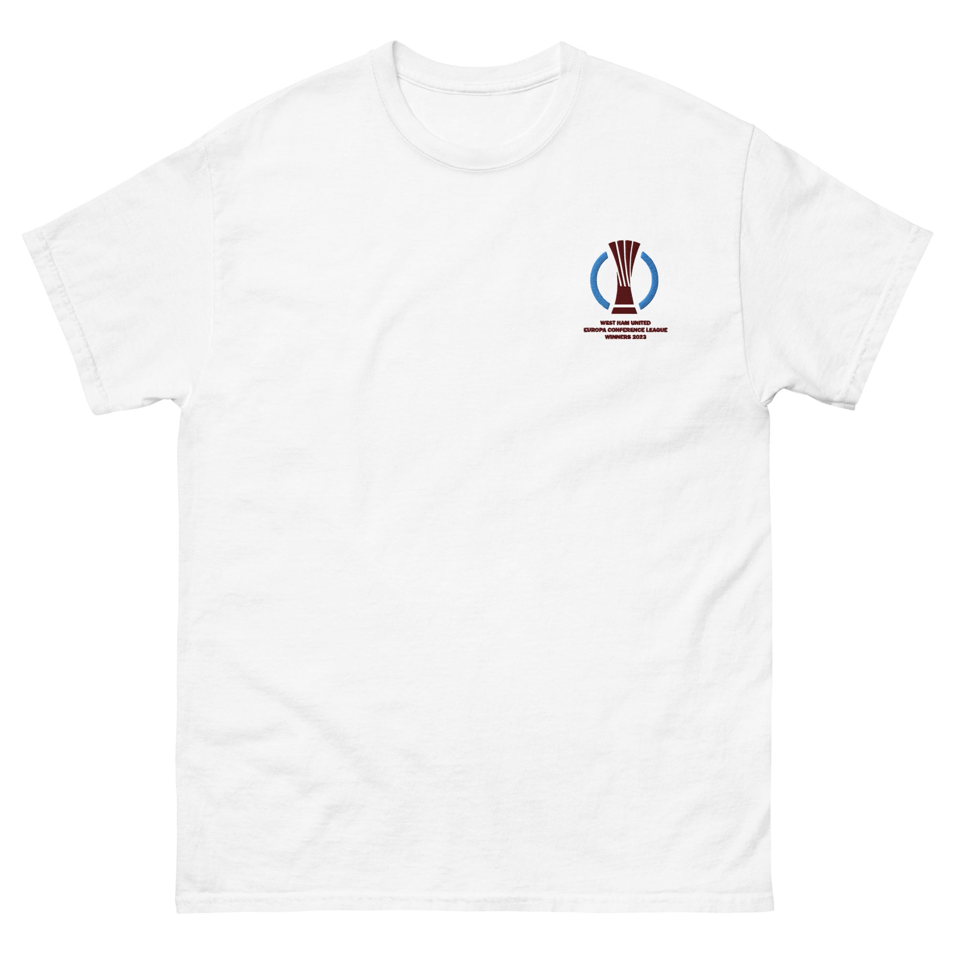 Introducing our exclusive West Ham United Europa Conference League Winners 2023 T-Shirt, a must-have for any devoted Hammers fan. This premium-quality garment features the official Conference League logo elegantly embroidered on the chest, symbolizing West Ham's historic triumph in the 2023 tournament.